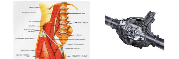 In other words, the function of the hips is exactly analogous to a car’s differential—and its shape is not that different, either. Both mechanisms consist of a series of components connecting three drive shafts in a T-structure (the left leg isn’t shown):