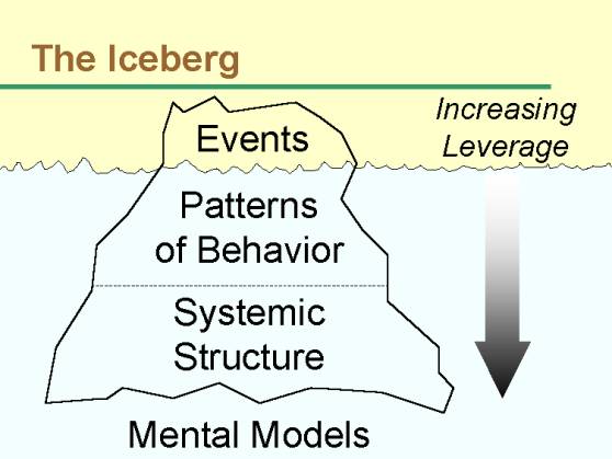 One of the key concepts of systems thinking is that “events” are generated by patterns of behavior, which are in turn generated by a systemic structure. This structure is predicated on certain underlying principles—certain goals and ideas that cause the system to have that particular shape: