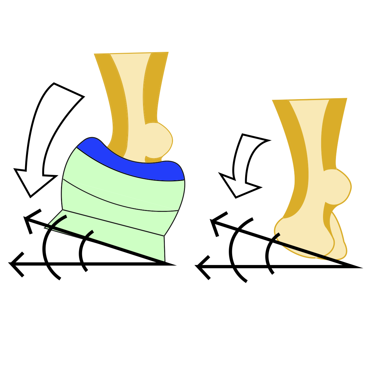 When running in maximalist shoes, the impact forces incurred during the landing phase are much greater. Take for example the following picture, which shows the back of a shod and an unshod foot. When the foot is fully pronated at the point of ground contact, the sole forms an acute angle with the ground. The vertex of the angle is the outside of the foot; the point of contact. When the runner is unshod, the sides of this angle aren’t very long. I represent this as the innermost arc (from the vertex). However, when the runner is shod, the sides of the angle are much longer; this is the outermost arc.