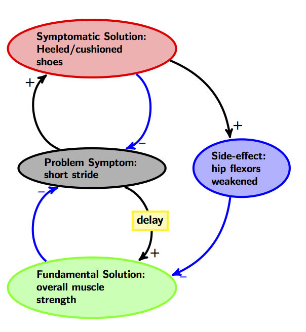 As I’ve discussed before, a shifting the burden system begins when there is a problem that needs to be solved. In this case, runners want to solve the problem of extending the stride some distance X. And to solve that problem, there is a quick-and-easy “solution:” slap a cushioned heel on the shoe and extend the leg forwards. But this “solution”—called the “symptomatic solution”—has a side-effect: by allowing the hip flexors to remain passive during the stride while the hip extensors (hamstrings, glutes, and calves) are relatively overactive, the system’s resilience is slowly being compromised: these two muscle groups are “unlearning” how to cooperate with each other to move the body.