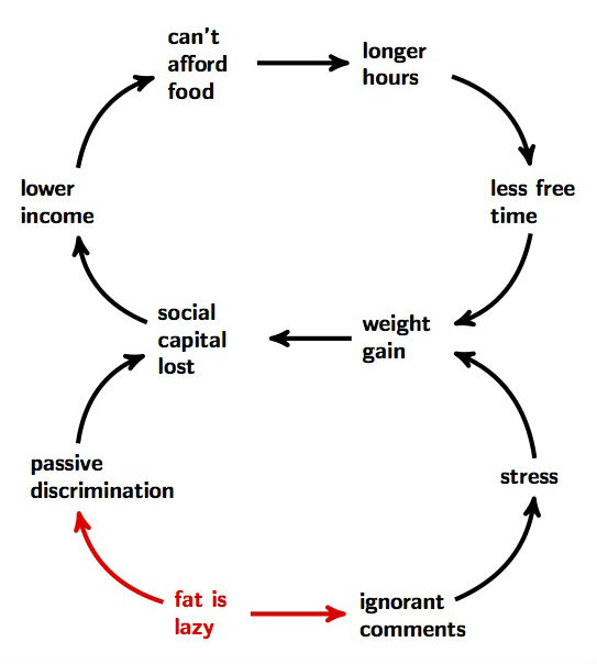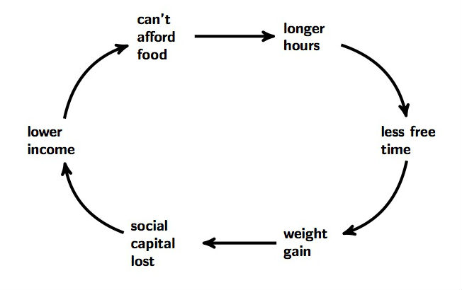 In order to diminish the expression of obesity in a population, the relevant feedback loops have to be understood. One such loop is created by the following factors. The high prices of unprocessed foods often make them prohibitively expensive to the poorest populations, who often have to work longer hours in order to make ends meet. With no time for visiting family, let alone constant, rigorous physical activity, people develop metabolic problems and gain weight. However, because obesity is perceived to be a product of laziness or poor character, the person often loses social capital. With this loss of social capital, the person loses job opportunities to slimmer, fitter individuals of “better character,” solidifying their poverty and destroying any possibility of change.